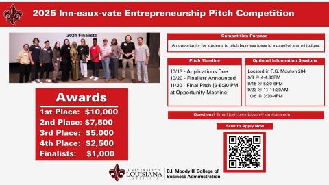 Dr. Josh Bendickson, Endowed Chair in Entrepreneurship & Innovation, is excited to announce the 2025 Inn-eaux-vate Pitch Comptetition. This year's competition will include more than $30,000 in prize money, with $10,000 going to the overall winner. The goals of the competition are to provide an opportunity for students to pitch business ideas to a panel of UL Lafayette alumni judges....and to possible earn seed money to help them start, commercialize and scale their business innovations.